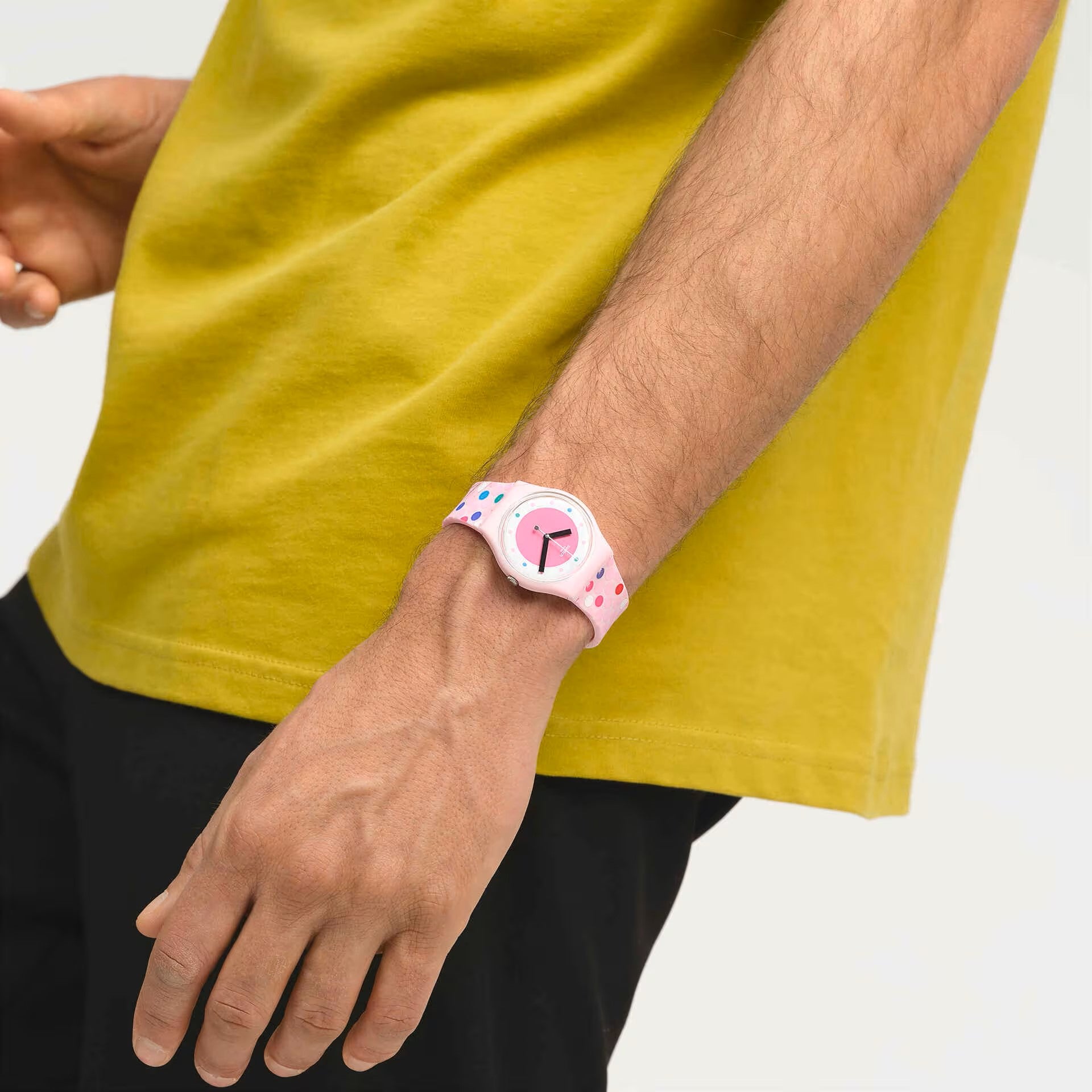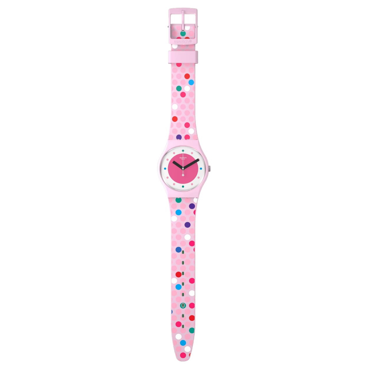 Cette montre ludique dotée d'un motif à pois possède un boîtier et un verre biosourcés roses ainsi qu’un bracelet rose imprimé.