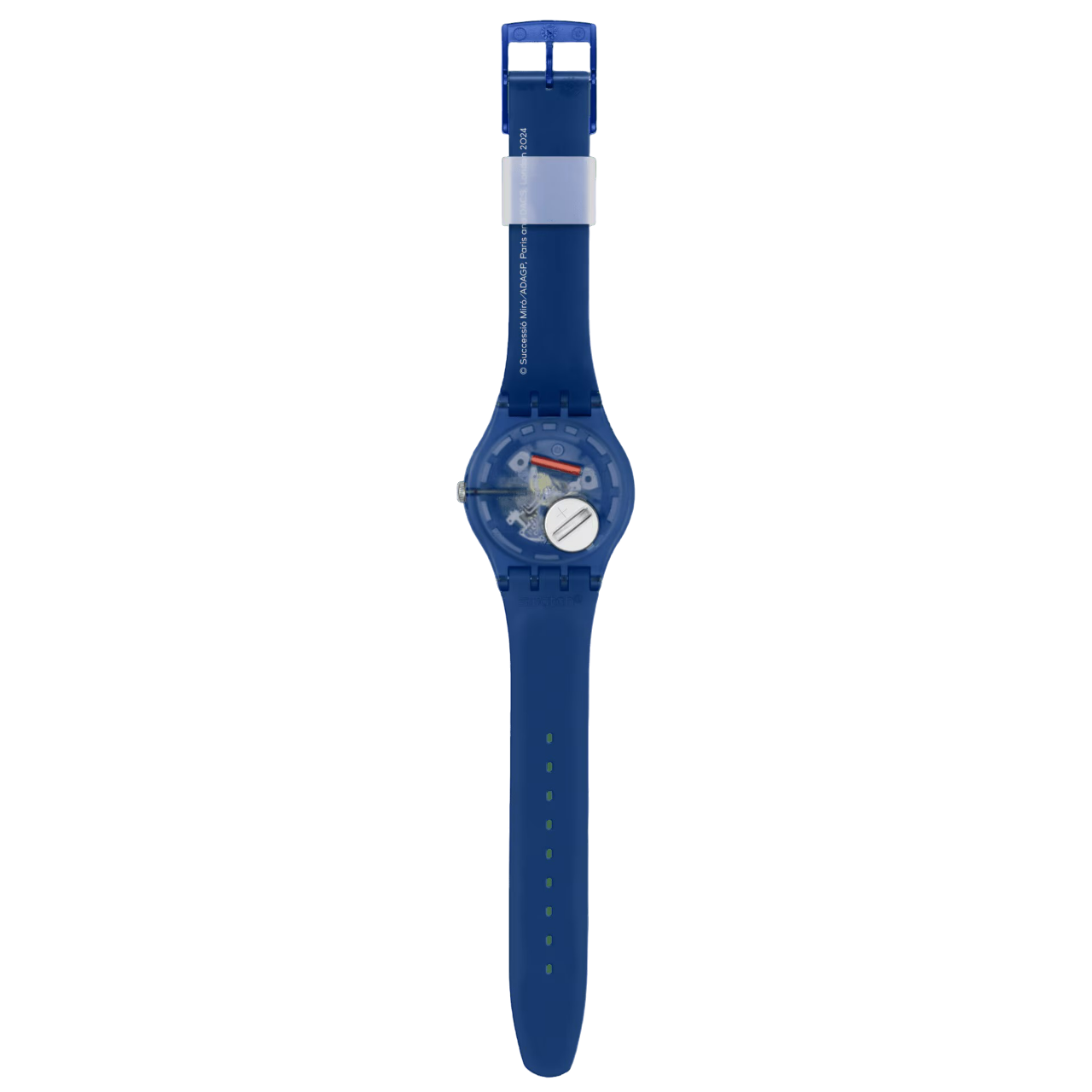 Cette montre de la collection Swatch x Tate Gallery a un boîtier transparent bleu foncé mat et un verre biosourcé à index imprimés blancs. Femmes, oiseau au clair de lune, par Joan Miró, est imprimé sur le cadran et le bracelet transparent bleu foncé mat. Les aiguilles des heures et des minutes sont bleues. Le logo de la Tate Gallery est imprimé sur le passant mat transparent. Joan Miró Femmes, oiseau au clair de lune 1949. © Successió Miró/ADAGP, Paris et DACS, Londres 2024. Photo : Tate / © Tate