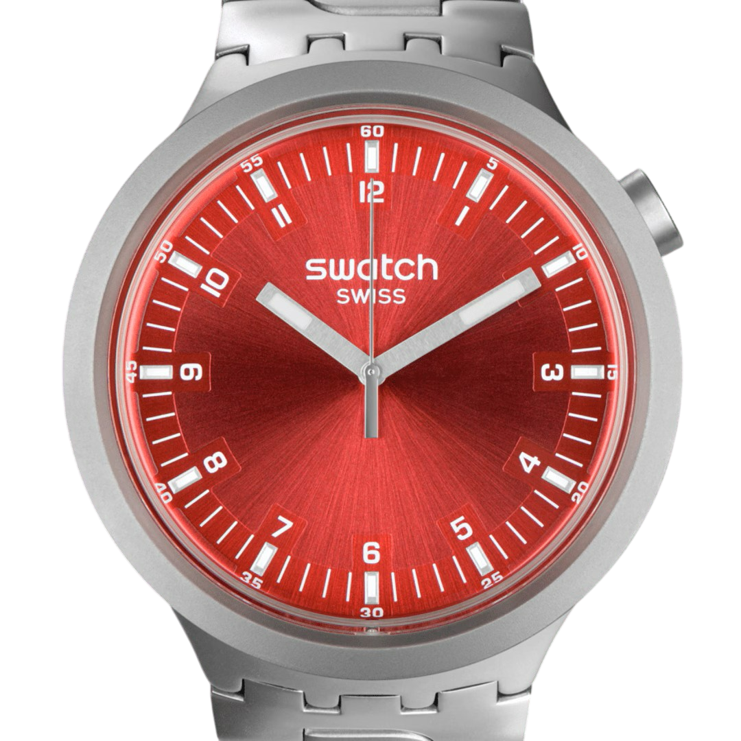 Cette montre oversize en acier inoxydable affiche un cadran bordeaux brossé soleil, des index blancs et des aiguilles argentées phosphorescentes. Le boîtier et la lunette sablés associés à un bracelet en acier inoxydable réglable complètent la montre.