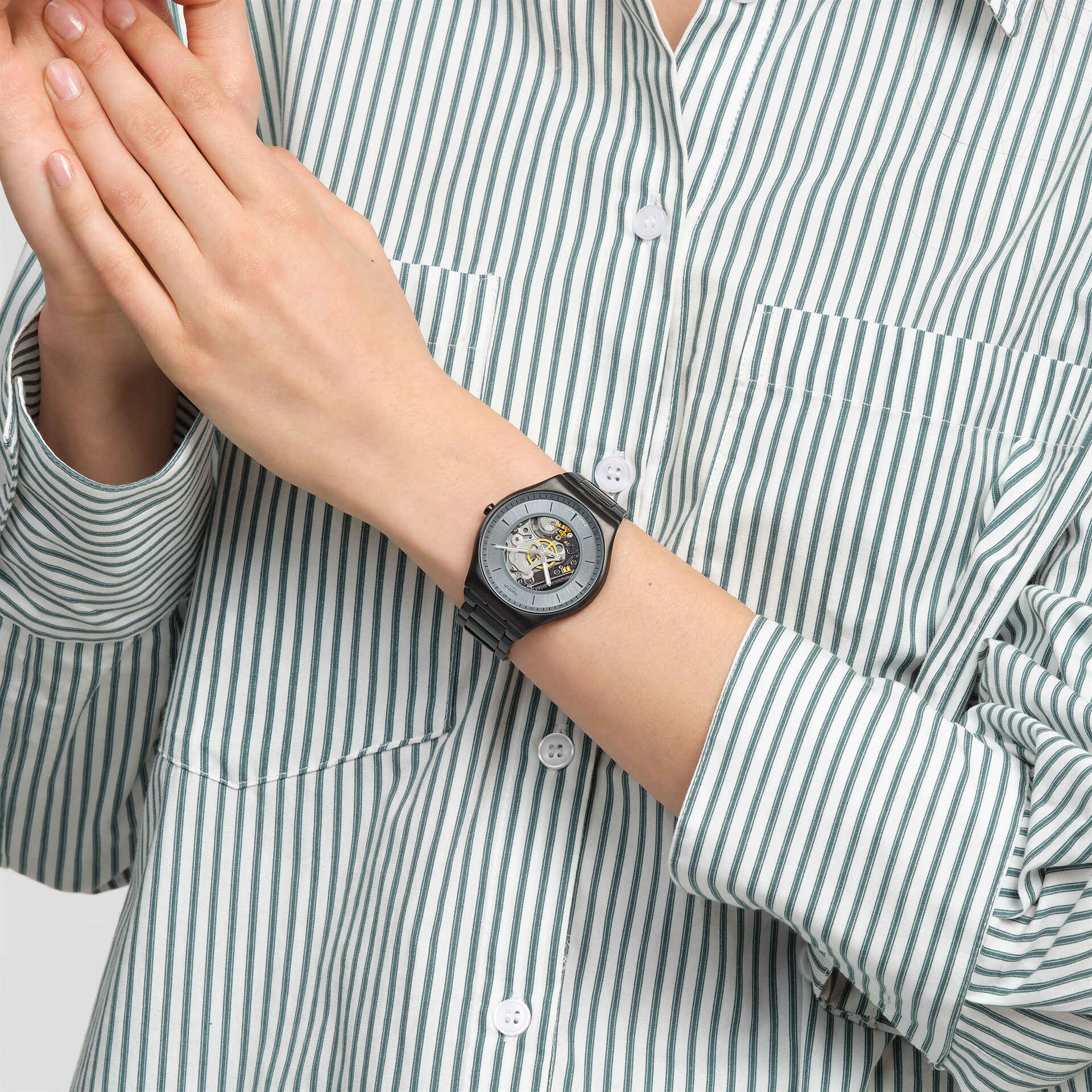 Cette montre ultrafine en acier inoxydable brossé à revêtement PVD noir a un cadran ouvert argenté avec une finition brossée soleil et un imprimé noir et gris ainsi qu’un anneau gris avec un imprimé noir. Son bracelet ajustable en acier inoxydable brossé à revêtement PVD noir et à boucle papillon complètent son look élégant.